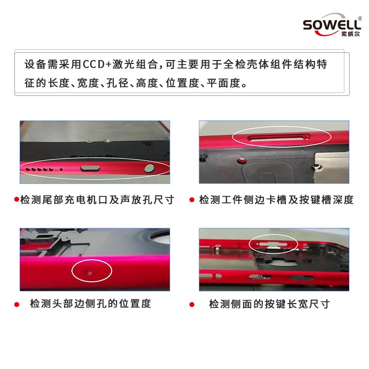 用機(jī)器視覺(jué)設(shè)備檢測(cè)手機(jī)殼電池蓋長(zhǎng)度、寬度、孔徑、高度、位置度、平面度,對(duì)缺陷進(jìn)行標(biāo)記,分類出合格和不良品。